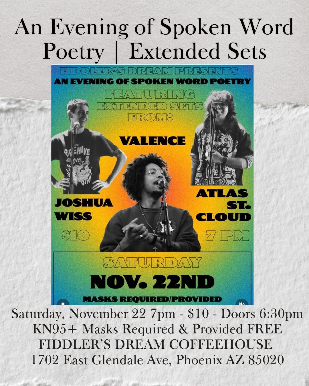 Join us for extended sets of Spoken Word Poetry showcasing Joshua Wiss, Valence, and Atlas St. Cloud! Visit our intimate listening room where you really connect with the performers and their spoken word poetry.