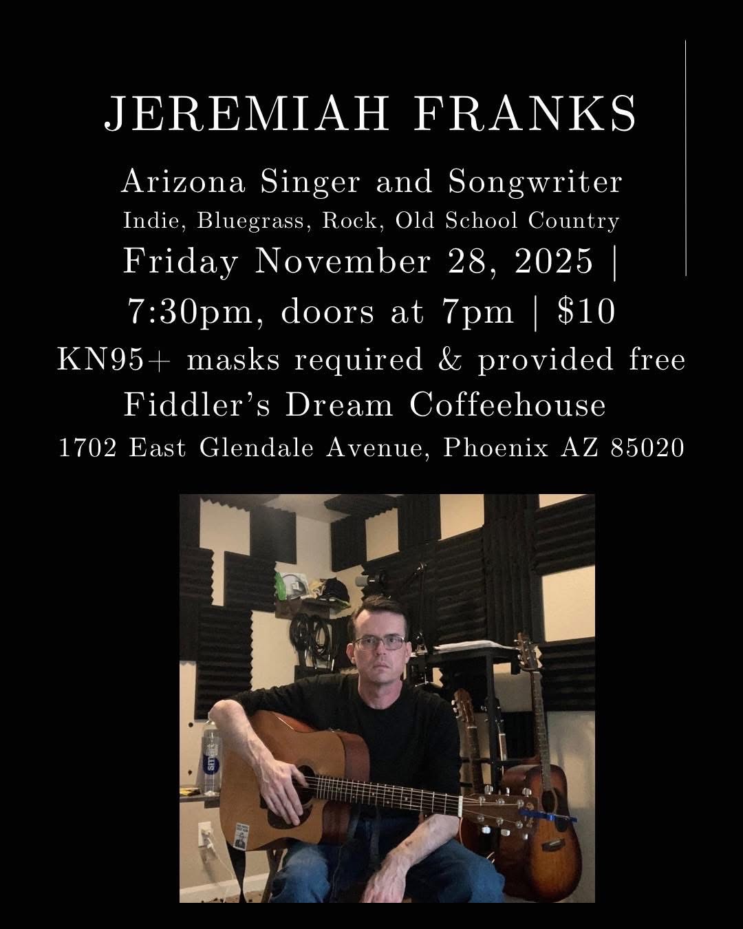 Friday, November 28, 2025, 7:30pm, doors at 7pm, $10 at door, KN95+ masks required and provided, at Fiddler’s Dream Coffeehouse, 1702 East Glendale Ave, Phoenix AZ 85020.