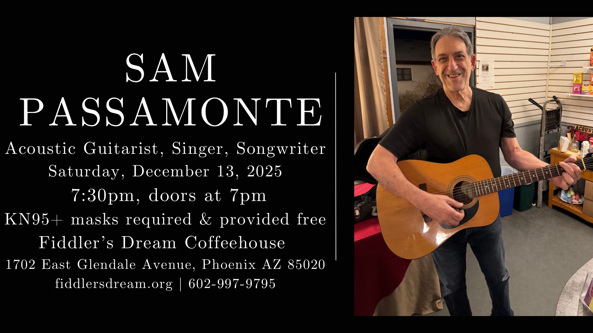 We are so happy to have Sam Passamonte playing his music at the coffeehouse again! Sam does favorite covers, some of them obscure, and has a few originals to share as well.